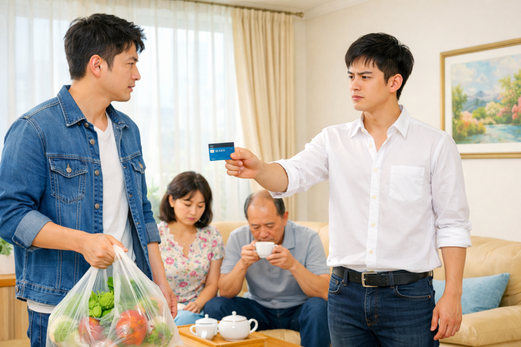 Em trai tôi, Lâm Tiểu Vũ, đứng trong phòng khách, tay cầm một chiếc thẻ ngân hàng, vẻ mặt lạnh tanh nhìn tôi.
