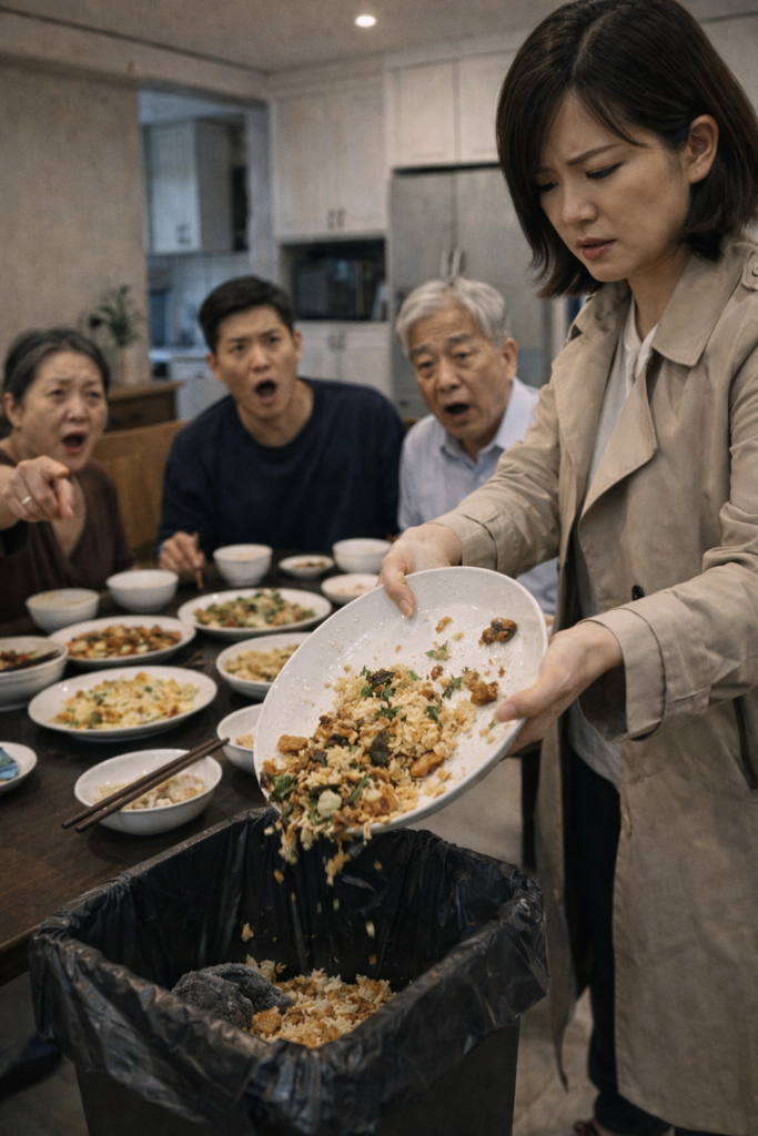 Quay người bưng hết toàn bộ thức ăn trên bàn lên, ngay trước mặt cả nhà, đổ sạch vào thùng rác.