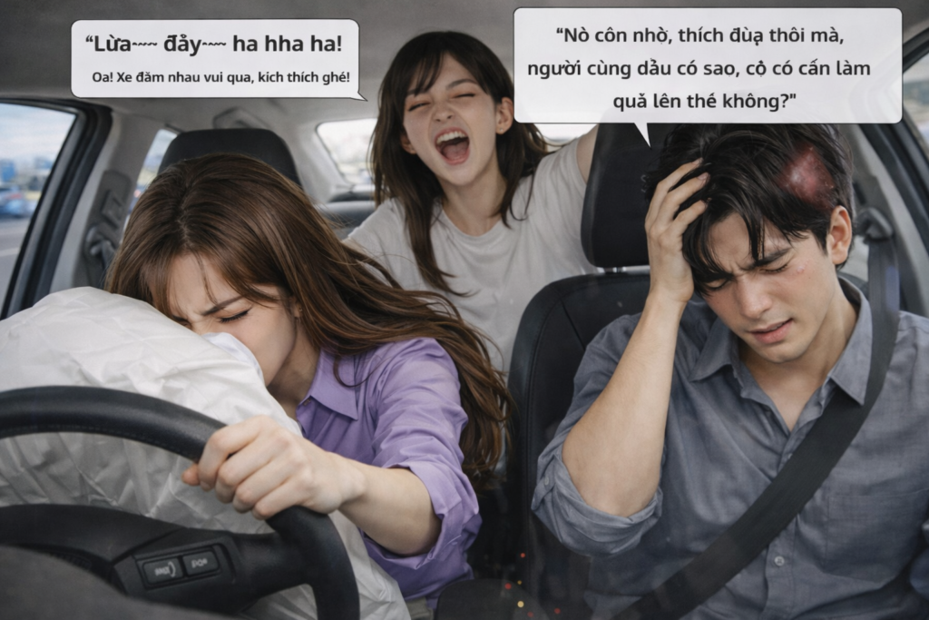 Ngay khoảnh khắc túi khí nổ bung trước mặt, tôi mới nghe thấy tiếng em họ cười hì hì đầy đắc ý: